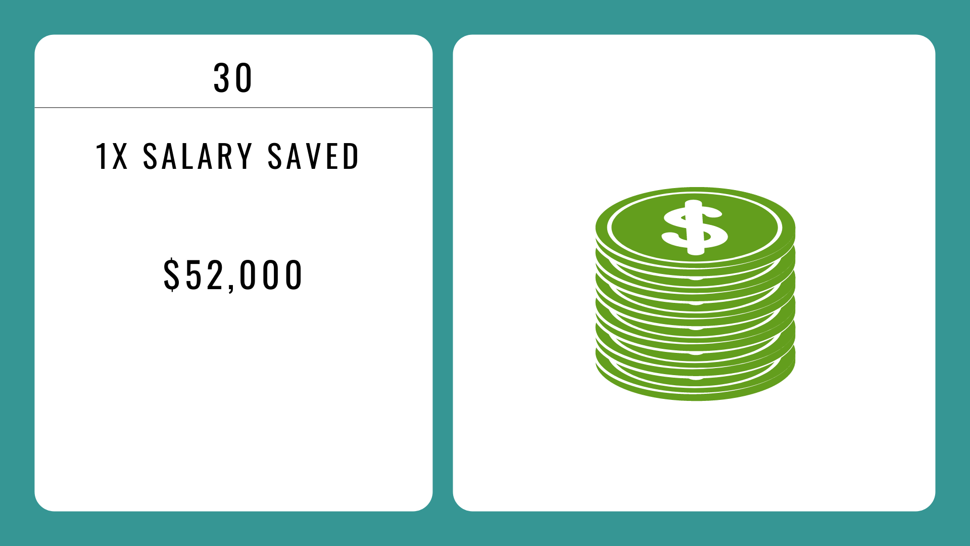 By age 30, you want to have saved 1x your annual salary. Let’s say that you make $52,000 (that is the average American salary in 2021 and will be using it for the rest of the article), then you should have saved $52,000.