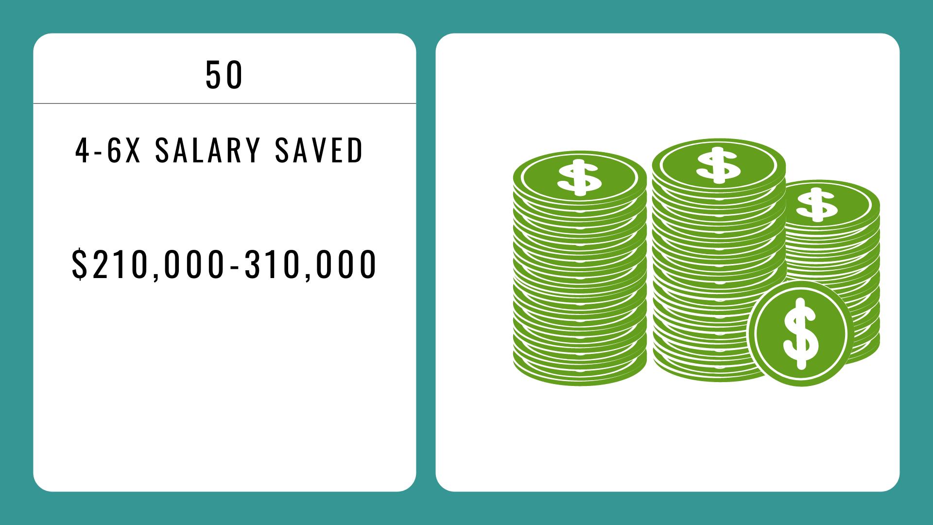 By the age of 50, you should have 4-6X your current salary. Based on a $52,000 salary, you should have around $210,000–$310,000.