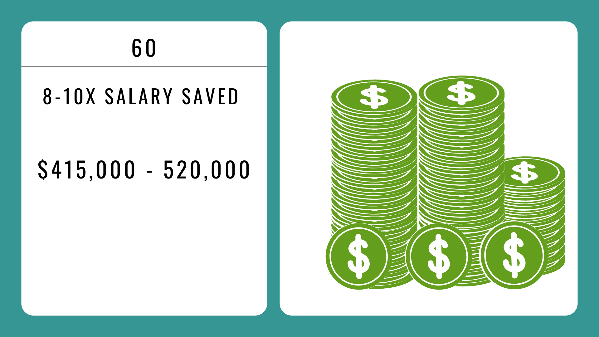 You should have eight to ten times your income by the age of 60. Based on a $52,000 salary, you should have around $415,000-$520,000.