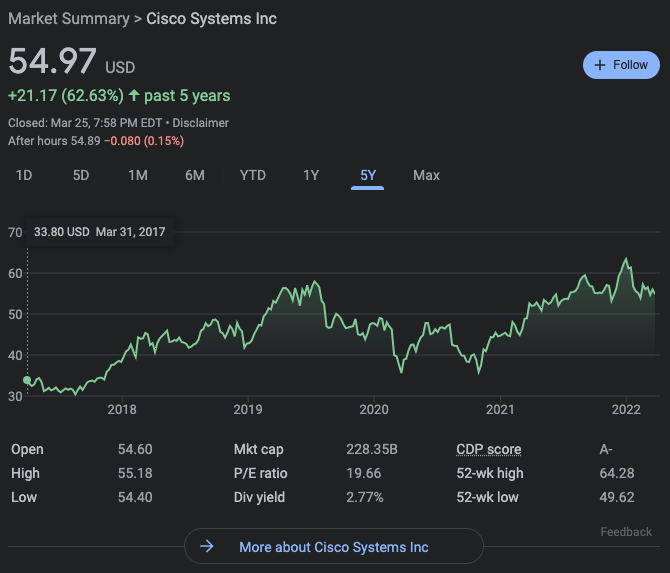 One great dividend company with a healthy payout ratio is Cisco Systems (CSCO). They have a payout ratio of 53%, which is healthy and sustainable. Their dividend yield is 2.77%, and those two factors together tell me that the company will be able to continue paying me in the near future.