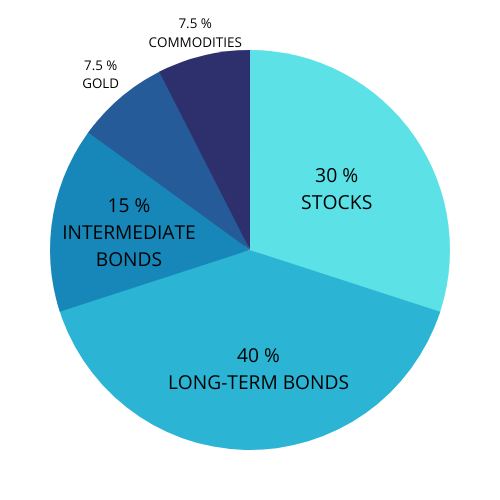 His strategy is to create a well-balanced portfolio that can perform well regardless of the economic cycle. The portfolio is divided between stocks, bonds, gold, and commodities. The portfolio would look something like this: