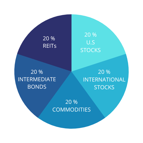 The portfolio is divided between U.S. stocks; international stocks; intermediate bonds; commodities; and real estate. The portfolio would look something like this: